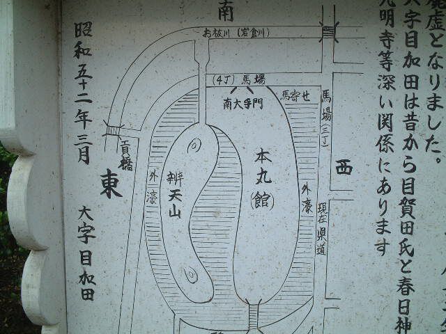 目賀田城は、前日に城郭体系をめくっていると載っていたのでふらっと立ち寄ってみました。岩倉川が東西に流れているだけでまわりは平坦とした土地が広がる目加田にはかつて城であった形跡が見られませんでした。しかし、おそらくこの岩倉川を堀がわりに利用していたはずだという感だけでだいたいのあたりをつけて車で流していると、イメージとおりのところに城跡が見つかりました。ちょうど公民館の南側にありますので、公民館を目指せば迷うことなく来ることができるでしょう。そこには城址碑と案内板があり、案内板によると目賀田城の縄張りまで掲載されていました。まわりには遺構らしきものは一切見当たらないのでとりあえず城址碑だけでも確認できたということで良しとし、この場を後にしました。